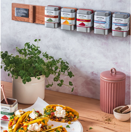 24 Spicebar Gewürzschätze in der Aromadose und 1 edles Holzregal.