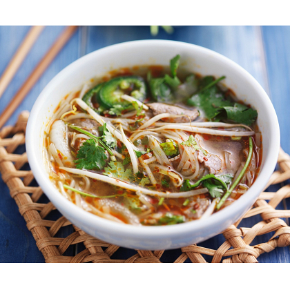 "Pho" besteht aus einer kräftigen Rinder-Brühe, speziellen Gewürzen, die wir alle in eine Spicebar Aromadose gefüllt haben, Reisnudeln, frischen Kräutern sowie kleinen, zarten Rindfleisch- (Pho Bo) oder Hühnerfleisch-Streifen (Pho Ga).