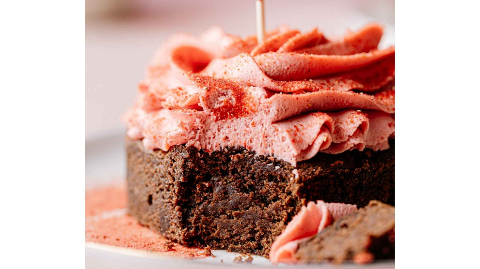 Das Frosting gleichmäßig aufspritzen und etwas Erdbeerpulver darüber sieben.