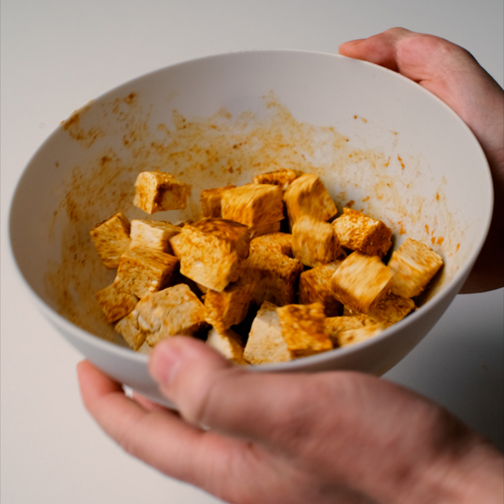 Tofu auspressen, in Würfel schneiden und trocken tupfen. Mit 1–2 TL Berliner Curry und dem Öl vermengen.