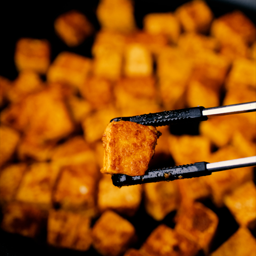 Den Tofu goldbraun anbraten und dann aus der Pfanne nehmen.