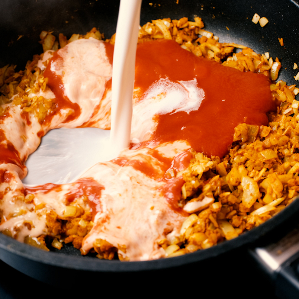 Passierte Tomaten einrühren, mit Kokosmilch und Gemüsebrühe ablöschen. Gut umrühren & aufkochen lassen.