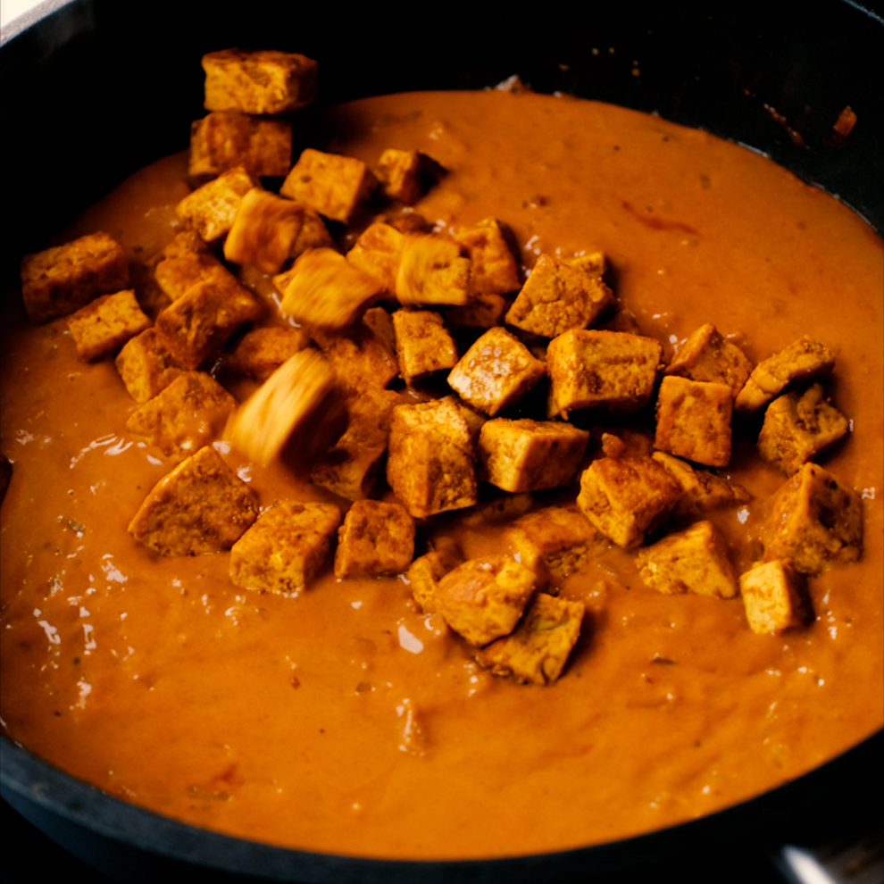 Zitronensaft & Ahornsirup unterrühren und mit Salz & Pfeffer abschmecken. Dann den gebratenen Tofu in die Soße geben und 5–8 Minuten leicht köcheln lassen.